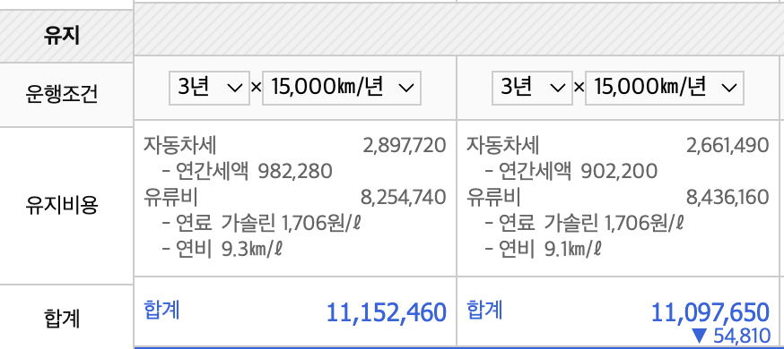 신차를 구매하시는 경우에 대부분 하나의 차량이 아닌 두대의 차량을 두고 고민을 하시는 경우가 많습니다. 이런 경우 가장 좋은 방법은 차량 스펙, 비용, 유지비을 비교해 보면 구매하시는데 도움이 되실 겁니다.